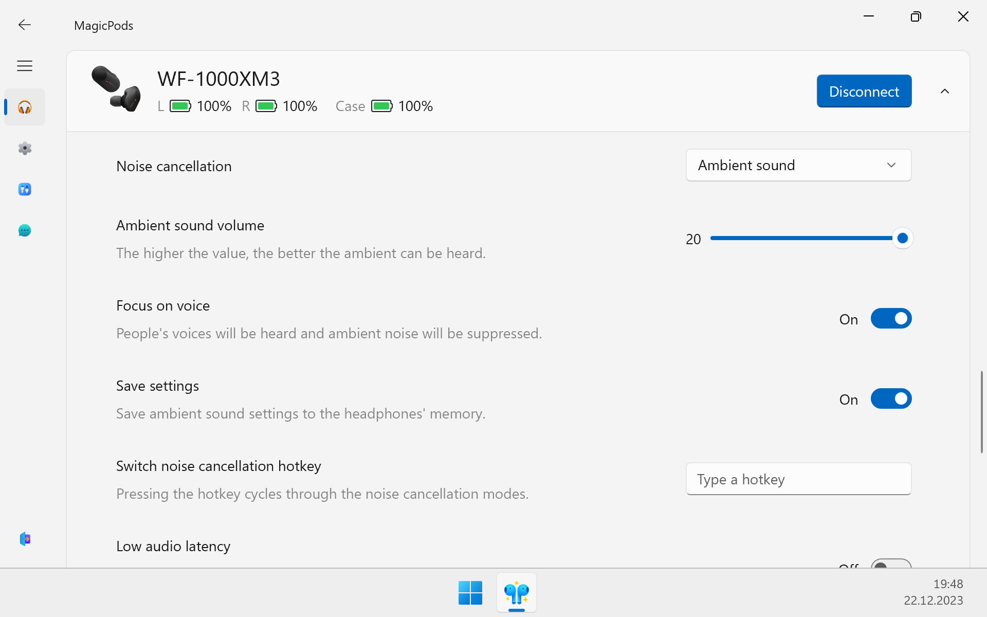 | Ambient sound | Additional settings available |